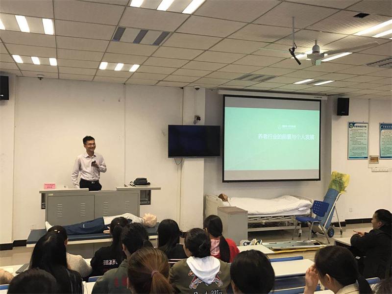 下午,龚思澄经理在护理学院第二实训楼306教室开展“养老行业的前景与个人发展”的专题讲座,讲座由专业负责人杨术兰老师主持,老年与保健管理专业全体学生及部分教师参加。讲座围绕目前中国的老年人口现状、养老现状、养老政策、养老模式等热点问题展开,与同学们深入交流了养老行业个人发展规划。龚经理还参观了学校中医中药文化馆、生命科学馆、老年保健与管理专业实训室,对我校的办学特色和实训室的建设给予了高度评价。