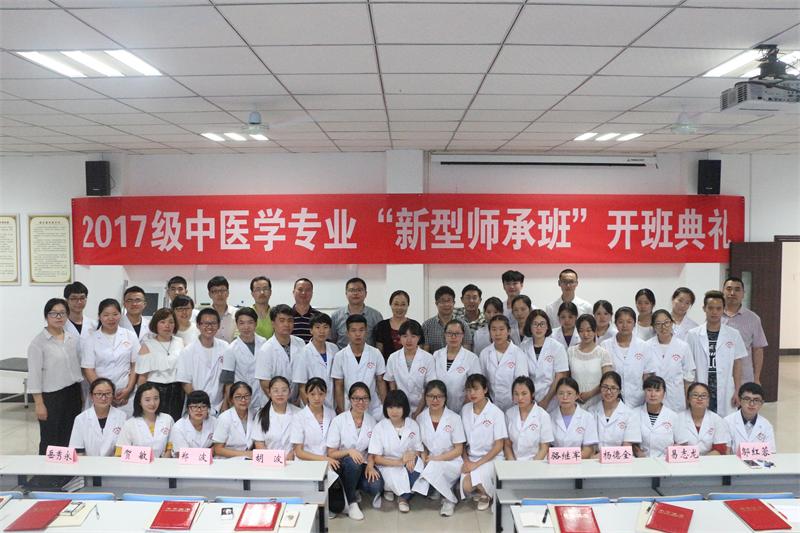 2018年6月14日下午, 2017级“新型师承”班开班典礼在学校第二实训楼209教室举行。中医系负责人和万州区名中医杨德全等10名师承班指导教师,2017级中医学师承班40名学生参加。