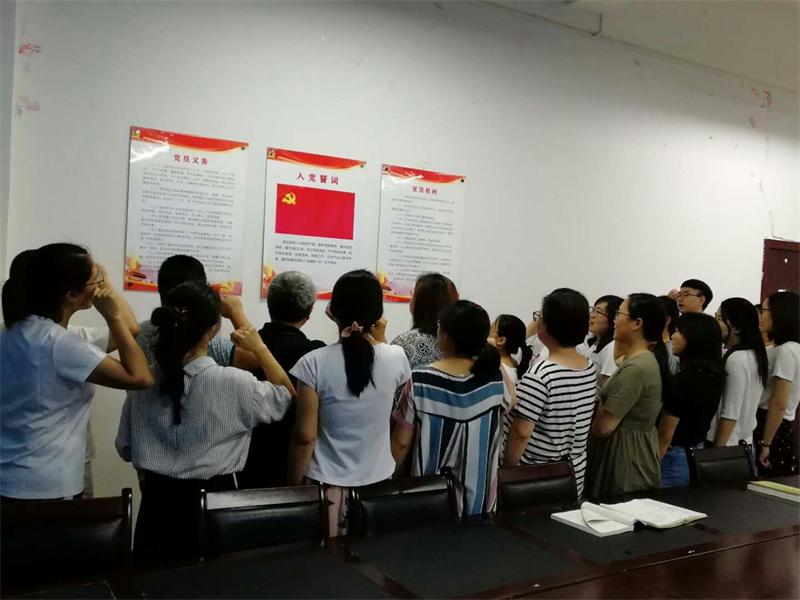 2018年6月28日,药学院党总支在学院会议室组织专题党日活动。为庆祝党的97岁生日,药学系全体教职工党员欢聚一堂,面对鲜红的党旗,重温党的誓词。党总支书记谭开键领誓,全体教职工党员高高举起右手,庄严而肃穆,那整齐而洪亮的声音在会议室铿锵有力,久久回响,充满激昂的情绪,充满喜悦的心情,充满美好的向往和执着的信念与追求。“我志愿加入中国共产党,拥护党的纲领,遵守党的章程……对党忠诚,积极工作,为共产主义奋斗终身,随时准备为党和人民牺牲一切,永不叛党。”