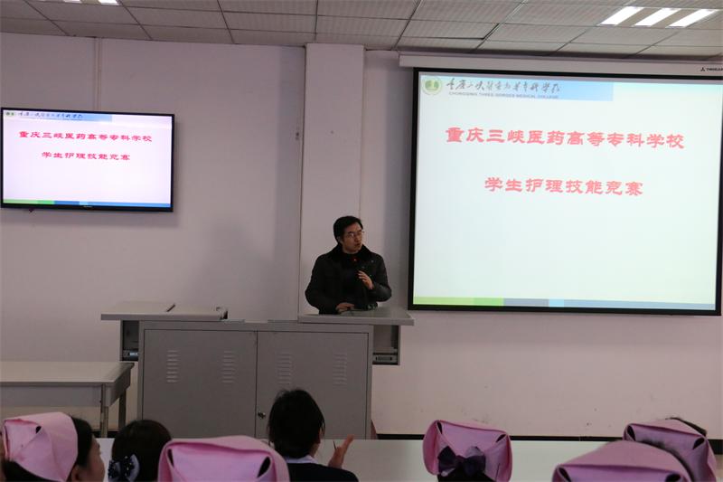 为提升护理系学生技能操作水平,同时为重庆市学生技能大赛选拔优秀学生,2017年12月19日下午,护理系在护理实训中心举办了2017年度学生护理技能竞赛。学校副校长沈力、护理系全体教师、55名参赛选手及部分学生志愿者参加了竞赛活动。