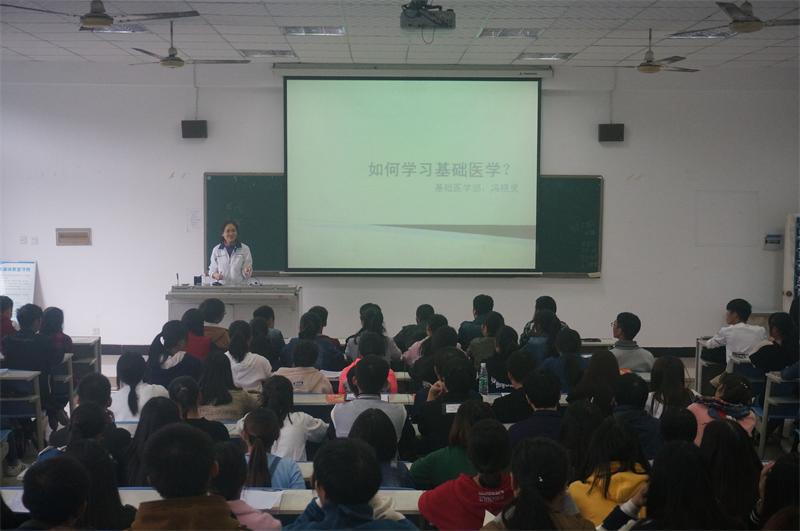 冯老师凭着自己丰富的教学经验,结合案例生动地讲述了怎样学习基础医学课程,如何形成自己的“专业思维”,并同时向同学们提出几点建议:1.目标明确:对自己未来职业要有明确的定位,没有时间去迷茫。需要明确目前的每一门基础医学课程能为你带来哪些职业帮助。2.不断学习,积累知识,即使学习任务很重,也要找好平衡点、选择点。