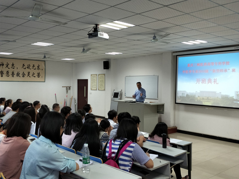 2017年6月13日下午, 2016级“新型师承”班开班典礼在第二实训楼209教室举行,中医系主任骆继军、党总支书记董江峡、2016级全体理论指导教师及40名师承班学生参加本次开班典礼。