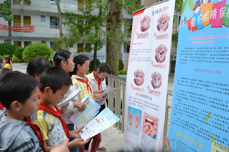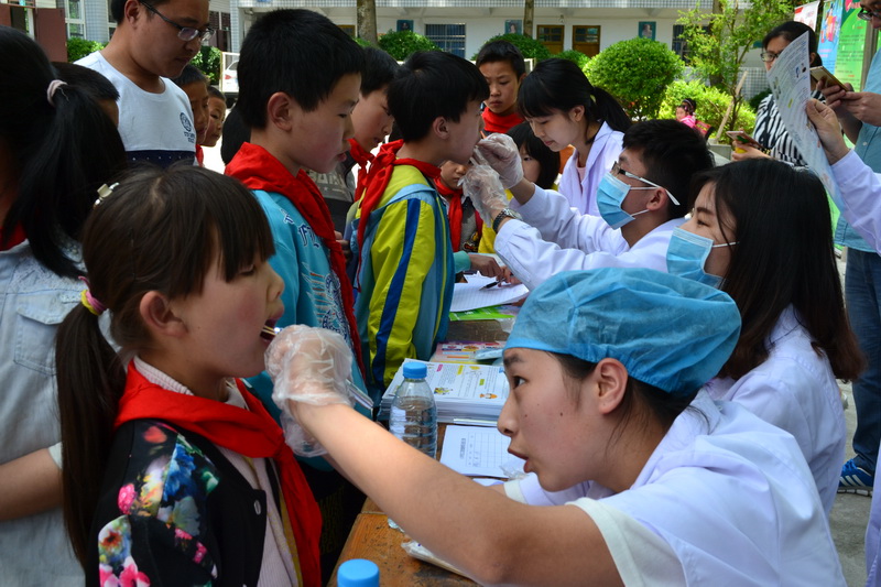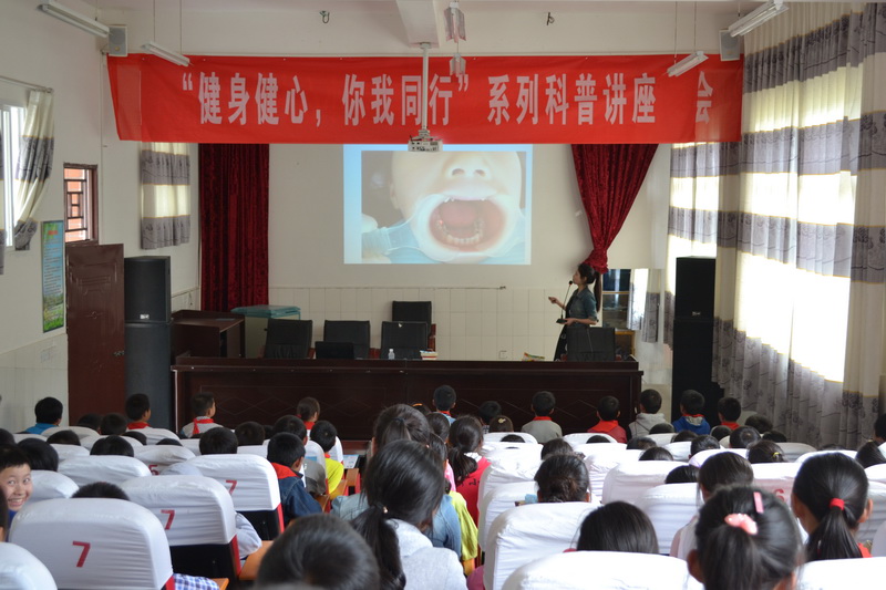 茨竹中心小学目前在校学生247人,其中留守儿童占了很大比例。到达茨竹中心小学后,我们在学校操场对四、五、六年级的同学进行了口腔健康检查,发放了宣传册,同学们都争先阅读。此外,开展了以“健身健心·你我同行”为主题的系列科普讲座活动之《眼睛是心灵的窗口》、《爱护牙齿》,详细介绍了口腔保健、用眼常识等实用的基本知识,提出了针对学龄期儿童的口腔保健建议,同时教会学生如何正确的刷牙:使用儿童保健牙刷,并采用竖刷法,上牙从上向下刷,下牙从下向上刷。