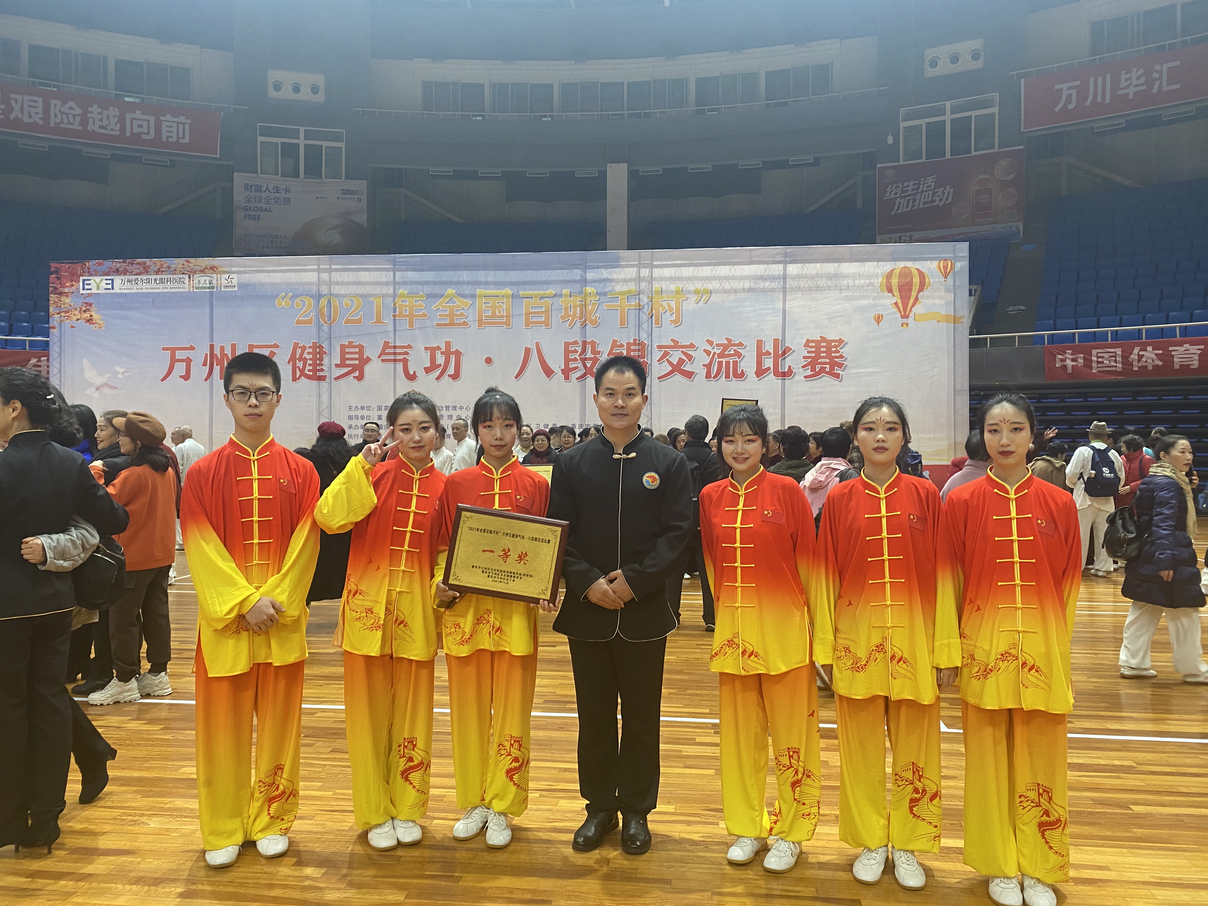 2021年“全国百城千村”万州区八段锦比赛于12月10-11日在万州区三峡之星体育馆举行,我校公共基础部李华斌老师带队参赛,经过激烈角逐,我校参赛队以优异表现荣获一等奖。