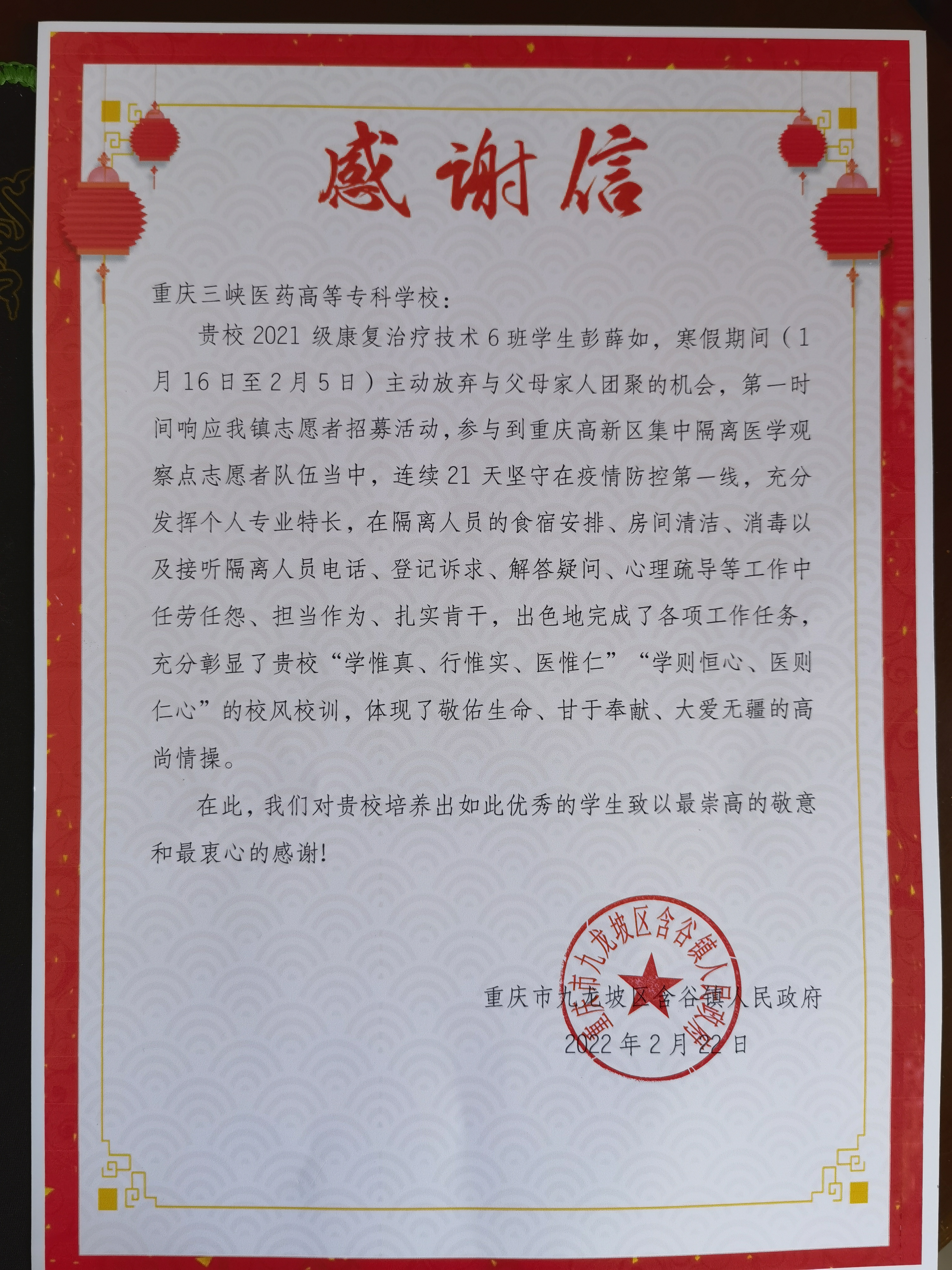 近日,学校收到了来自重庆市九龙坡区含谷镇人民政府的感谢信,信中充分肯定了中医学院21级康复治疗技术6班的彭薛如同学在寒假期间参加志愿者活动,连续21天坚守在疫情防控第一线,担大任、承大责的青年风范,以及对学校的教育工作致以崇高的敬意和感谢!