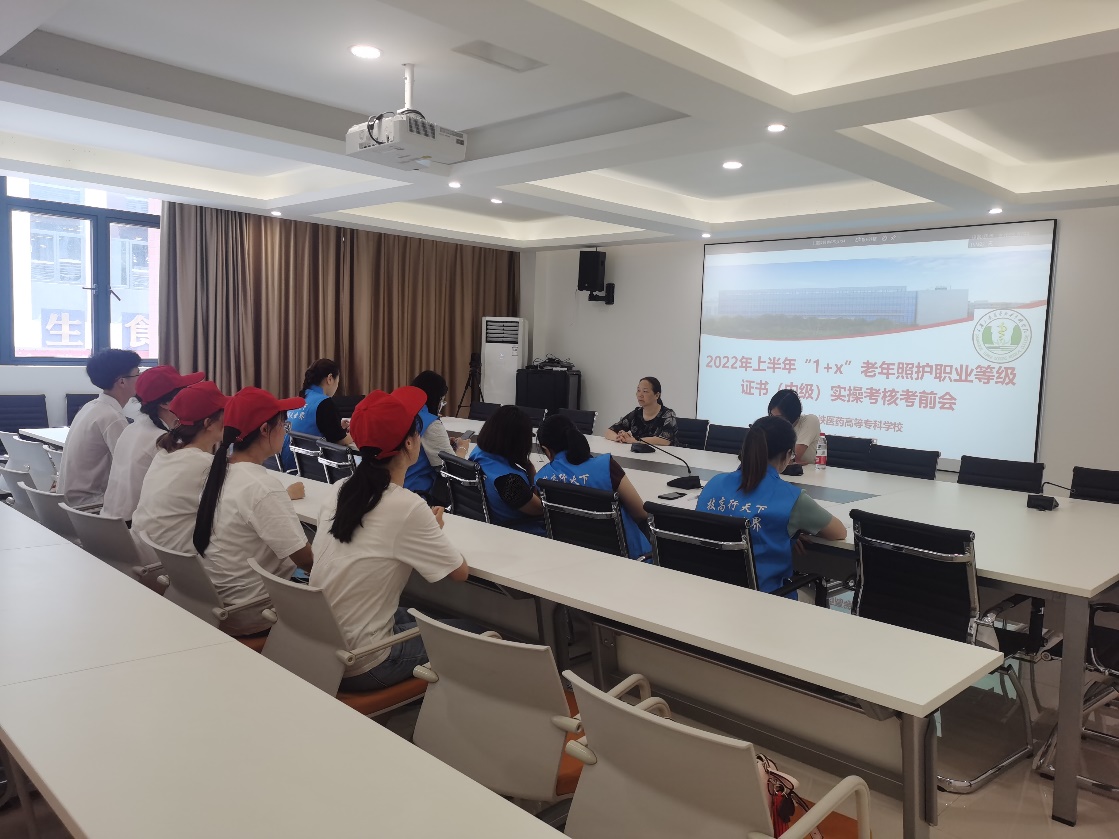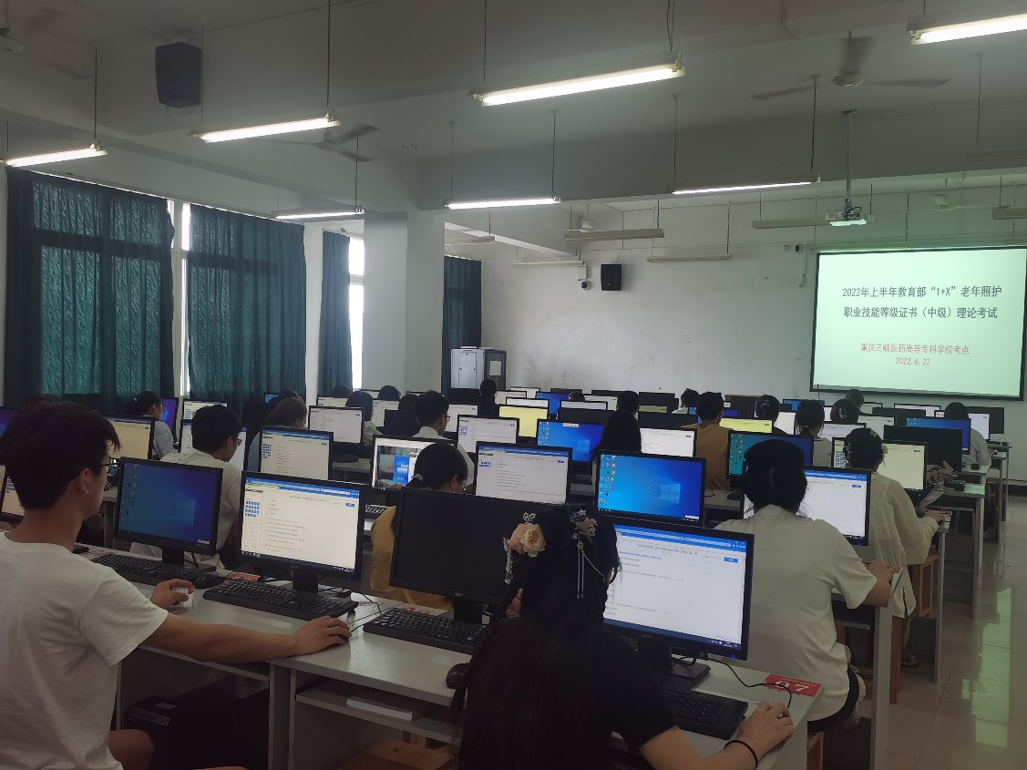 2022年6月22日,教育部上半年“1+X”老年照护职业技能等级(中级)考试在我校举行。护理学院圆满完成了50名在校学生的理论和实操考核工作,总通过率为100%。重庆涪陵工贸职业技术学校的2名考评专家亲临指导,考务安排井然有序,得到了考评领导和专家的一致好评。