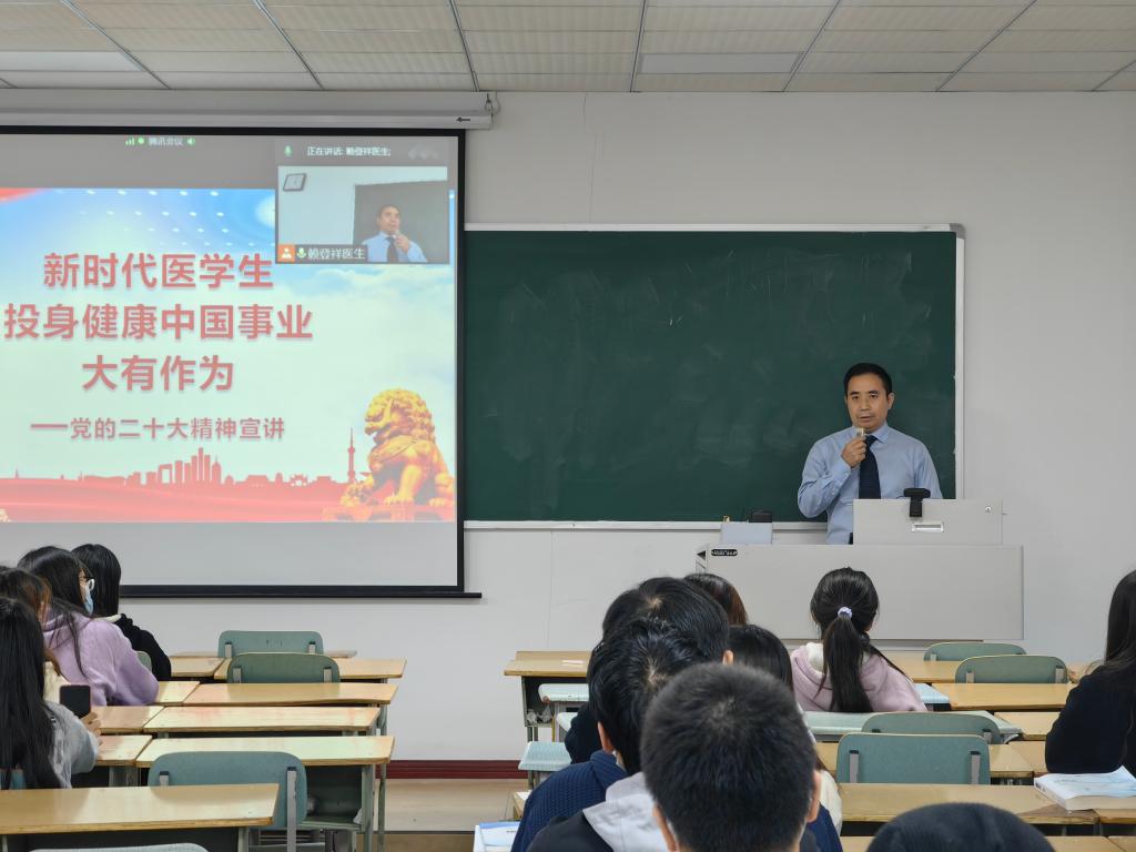 11月18日,临床医学院党总支书记赖登祥,以《新时代医学生投身健康中国事业大有作为——党的二十大精神宣讲》为主题,在附院科教楼大教室以线下+线上相结合的方式,开展党的二十大精神“形势与政策”课。临床医学院党总支副书记程晓莉以及全院2300余名师生参会学习。