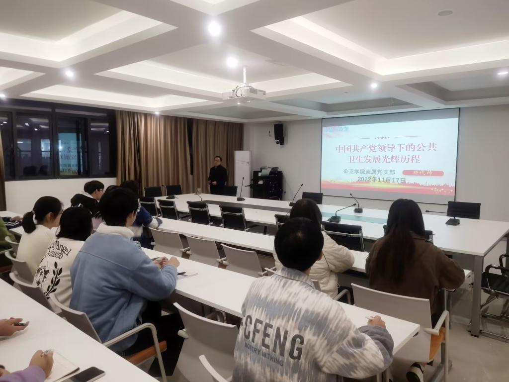 为深入学习宣传贯彻党的二十大精神,11月17日下午,公共卫生与管理学院在B6-515会议室,举行“中国共产党领导下的公共卫生发展光辉历程”形势与政策专题讲座。学院直属党支部副书记郑代坤担任主讲人,2022级各班班长、副班长、团支书及学生代表60余人聆听讲座。
