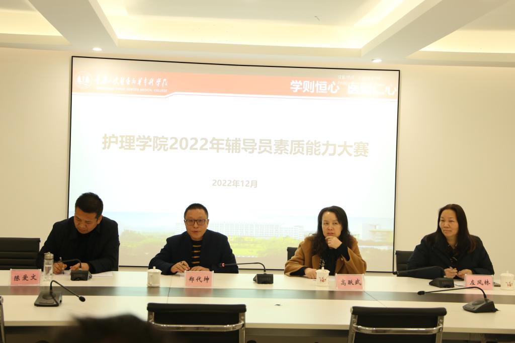 为深入贯彻党的二十大精神以及习近平总书记关于教育的系列重要论述,进一步落实高校思想政治工作会议和学校思想政治理论课教师座谈会精神,着力提升我院辅导员的理论水平、职业素养和工作能力,推动辅导员队伍专业化、职业化建设,不断提升大学生思想政治教育工作质量,护理学院于12月7日晚在B6-315会议室举行辅导员技能大赛,学工部部长高跃武、副部长李春光、公共卫生与管理学院副院长郑代坤、学院党总支书记陈爱文、院长左凤林、副院长李为华和全体专职辅导员现场观摩比赛。
