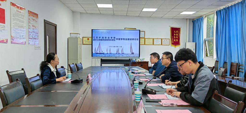 会上,苏绪林代表中医学院对王朝来校考察交流表示热烈欢迎,并从学校的历史沿革、专业设置、办学理念,学院的教学科研基本情况、中医学专业人才培养情况等方面作了简要介绍。郑代坤介绍了预防医学的专业建设、人才培养、实训室建设等情况。王朝对中医学、预防医学专业的专业建设成果、人才培养质量表示赞赏,介绍了江苏护理职业学院的发展历史、办学现状、专业特色。她表示,希望两校在人才培养模式改革、在线开放课程、中医文化建设等方面深化合作交流。