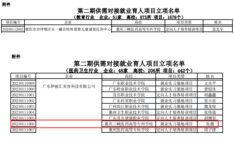 近日,教育部高校学生司发布了《关于公布第二期供需对接就业育人项目立项名单的通知》(教学司函〔2023〕6号),中医学院医学美容技术专业与广东伊丽汇美容科技有限公司合作的就业实习基地项目、康复类专业与重庆市沙坪坝区乐一融合特殊需要儿童康复托养中心合作的定向人才培养培训项目均获批供需对接就业育人项目。中医学院是第二次在该项目成功立项。