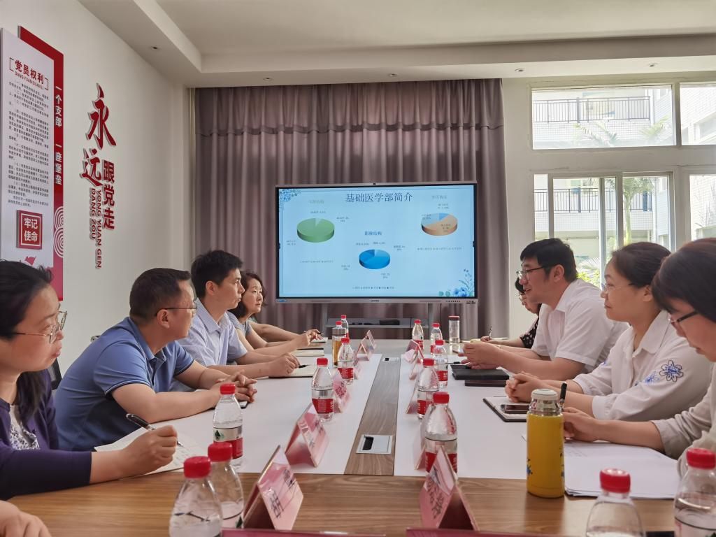 会上,李国利对张宝成一行的到来表示热烈的欢迎,并简要介绍了部门的基本情况。张宝成对我校的热情接待表示感谢,介绍了安徽中医药高等专科学校基础教学部的办学历史、学科建设等基本概况,高度赞赏了我校校园文化建设、基础医学课程建设、创新团队建设、实验实训建设等方面的创新成果。他表示,我校在医药卫生办学育人事业中形成了深厚积淀和光荣传统,近年来实现了国家优质高等职业院校、中国特色高水平高职学校和专业建设计划等的高质量发展。本次调研旨在通过学习借鉴我校在学校发展、教育教学等方面的成功经验,进一步推进两校交流合作,共同提高人才培养质量。随后,双方围绕国家级样板支部建设、人才培养、课程建设、科研创新工作、实验实训建设等方面进行深入交流。