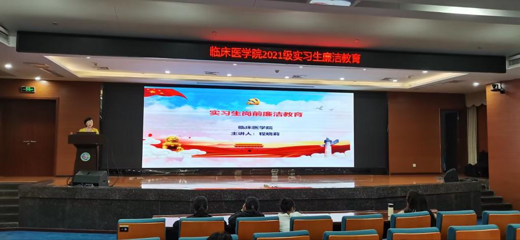 为深入开展学习贯彻习近平新时代中国特色社会主义思想主题教育,认真落实党中央《关于加强新时代廉洁文化建设的意见》精神,6月14日晚,临床医学院在附属人民医院高笋塘院区综合楼学术厅开展实习生岗前廉洁教育专题讲座,由副书记程晓莉担任主讲,附院教学基地176名同学现场聆听,临床医学院校本部及区外教学基地约1000名2021级学生线上学习。
