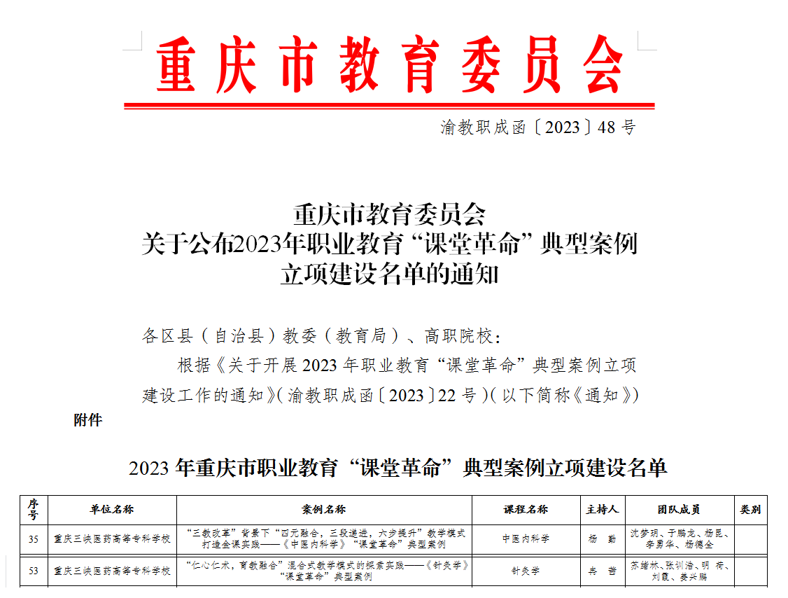 6月28日,重庆市教育委员会公布了2023年重庆市职业教育“课堂革命”典型案例立项建设名单,我校中医学院《中医内科学》《针灸学》两门课程成功立项建设。