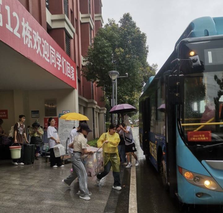 早上7:30,雨声潺潺,同学们身穿雨衣,在现场老师们的指导下,通力协作将卧具、各类行李打包编号,分组装车护送至附属人民医院教学基地寝室。为方便同学们完成搬运,学校为师生提供了校内转运车、巡逻车免费搬迁服务,学生处为同学们提供了“小黄车”、“雨棚”等应急保障,保卫处通过技术手段帮助陈雪等同学找回丢失的行李箱,附属人民医院与临床医学院则充满温馨的准备了晕车药、葡萄糖、藿香正气液、挡雨布等物资,大家互帮互助,齐心协力,即便天公不作美也抵挡不住同学们进入基地求学的脚步,不仅为校园增添了一道靓丽的风景,也更加彰显出师生之间、同学之间的深厚情义。