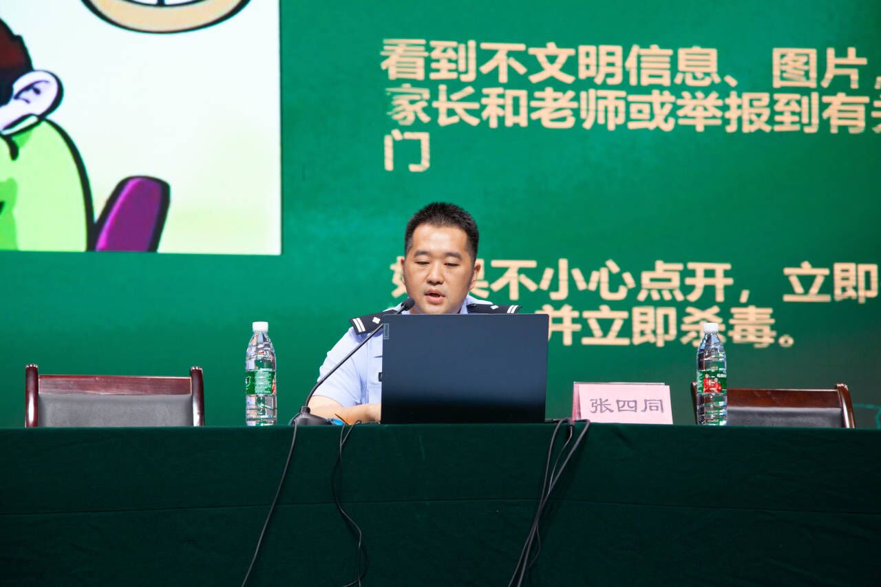 网络空间不是法外之地。张四同警官为同学们解释了“网络安全”的意义,强调网络系统数据受法律保护,任何人不得进行破坏,如遭受破坏,会追究破坏者和网络主体责任人的法律责任。随后,张四同警官科普了安全上网和文明上网常识,为大家呈现了互联网的美妙与可怕之处,表示同学们在网络世界冲浪开阔视野、获取咨询、方便生活与沟通的同时,注意防范木马病毒与钓鱼网站,谨防沉迷网络。并提醒同学们要规范自己网络行为,不造谣、不信谣、不传谣,拒绝网络暴力,保护好自己个人信息。