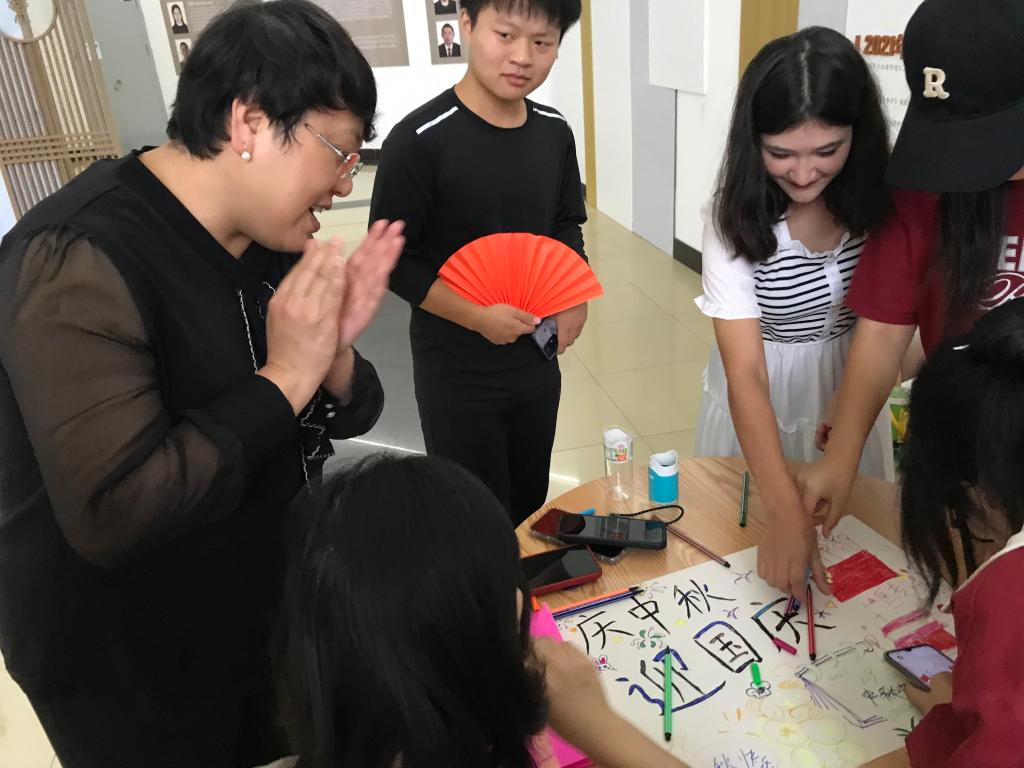 活动中,师生相聚一起开始趣味浓厚、情意浓浓的破冰活动、小组比拼、共绘中国画、同祝祖国好等团建活动。“马兰要开花”活动,同学们手牵手,心连心,欢声笑语,亲如一家,共画同心圆;“你画我猜”活动,同学们手舞足蹈,协同共进,各种炫技,畅怀大笑,凝心聚力,共享团队情;“巧手迎中秋”剪纸做灯笼,同学们心灵手巧,各显神通,聚精会神,共促文化融;“共绘中国画 同祝祖国好”绘制祖国画卷活动,同学们认真构思,集思广益,发挥创造力和想象力,用色彩点燃爱国情怀,共绘爱国心。现场各小组斗智斗勇、你追我赶、相互帮助、团结一心,气氛火热、融洽,让来自不同民族的学生们感到心更暖、月更圆、情更满,使得全体师生的民族共同体意识进一步加强。学院还特意设计了“一封家书寄相思”活动,将同学们对家人、朋友的思念、感恩、祝福之情用书信的形式传递,学院负责给同学们统一邮寄。学院通过展信笺,写相思,寄深情串联感恩之心,弘扬中华民族传统美德,丰富和延伸“三全育人”内涵。