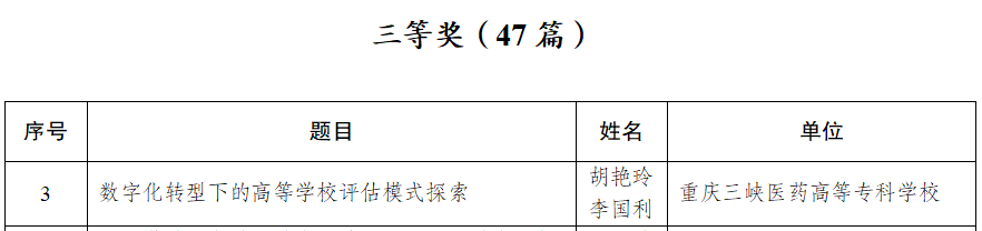 11月15日,重庆市教育委员会、重庆市人民政府教育督导室公布了重庆市第六届教育督导典型案例及研究论文评选结果,基础医学部胡艳玲、李国利撰写的题为《数字化转型下的高等学校评估模式探索》研究论文荣获三等奖。