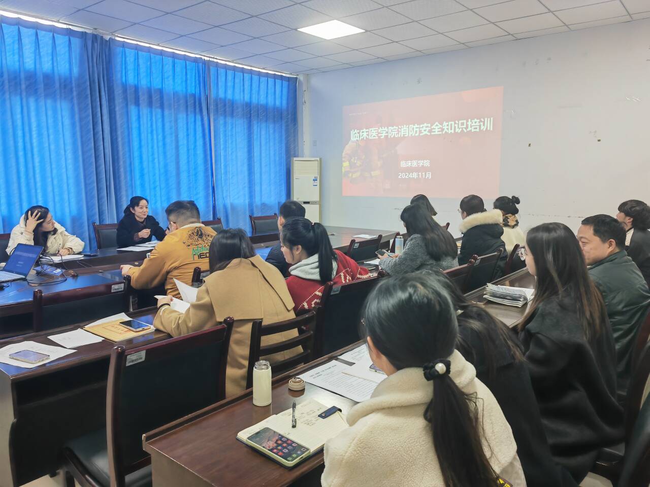 为进一步提升学院师生的消防安全意识,增强全员自防自救逃生能力,推动落实消防安全责任,强化消防安全风险防范,切实筑牢消防安全防线。11月26日,临床医学院在学院408会议室组织消防安全知识培训会,全体教职工参加。