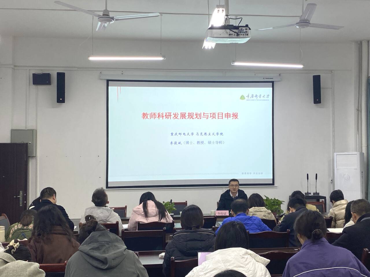 12月4日,马克思主义学院邀请重庆邮电大学硕士生导师、博士、李俊斌教授作《教师科研发展规划与项目申报》的专题讲座。讲座由马克思主义学院党总支书记、院长陈爱文主持,学院全体教职工参加。