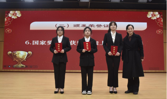 会上,孙璞宣读了国家奖学金、国家励志奖学金、筑梦奖学金、卓越奖学金、评优评先、创新创业大赛等表彰文件,经过严格评审,共有6个先进班集体和400余名学生荣获各类荣誉。在表彰环节,参会老师代表为获奖学生代表颁发了荣誉证书。国家奖学金获得者胡莹和国家励志奖学金获得者杨璐作为代表,在大会上分享了学习经验和心得,胡莹同学从学习、素质提升、活动参与和兴趣爱好四个方面,讲述了如何规划职业道路,高效利用时间;杨璐同学则分享了如何制定计划、设定目标,并用量化方式逐步实现理想的经验,两位同学的发言赢得了现场师生的热烈掌声。此外,周鑫鑫宣读了《合理使用奖助学金倡议书》,倡导同学们合理使用奖助学金,助力学业顺利完成。