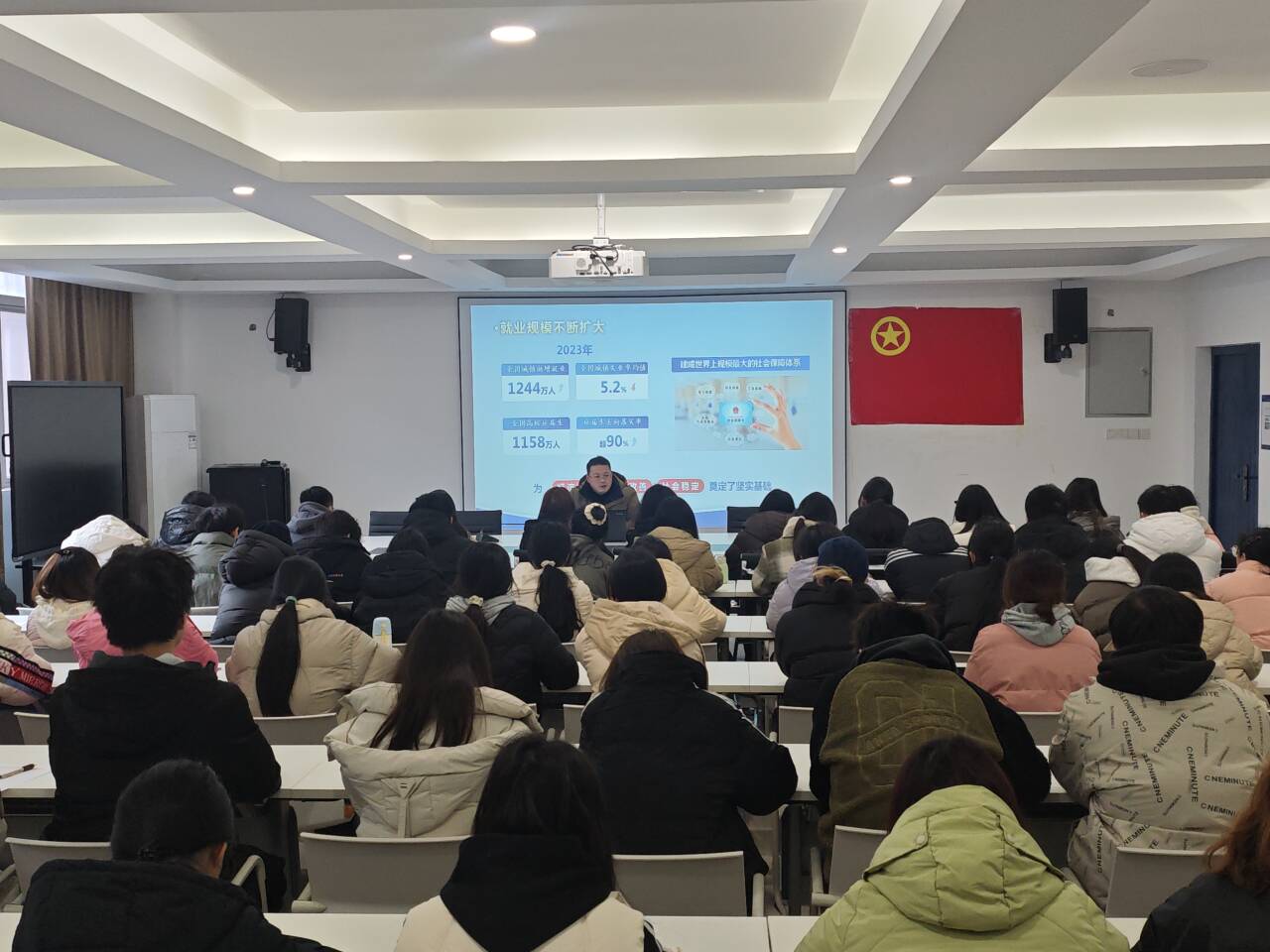 郝坡从当前我国就业形势总体稳定,就业短期风险和长期挑战的压力仍然存在,对实施就业优先战略的重要举措和拓宽高校毕业生就业渠道而推出的各项措施及其成效等方面进行了讲解;对我国一直以来将就业摆在经济社会发展的优先位置,把稳就业提高到战略高度通盘考虑,推动实现更加充分、更高质量就业的优先战略进行了强调;同时结合实例,根据学院各专业毕业生历年就业情况,让同学们了解了所学专业的就业路径。通过深入浅出的讲解,郝院长希望同学们正确认识当前就业形势,科学理性看待就业面临的问题和挑战,正视当前“就业难”问题,叮嘱大家早做规划、尽早行动,树立符合时代需求的就业观。