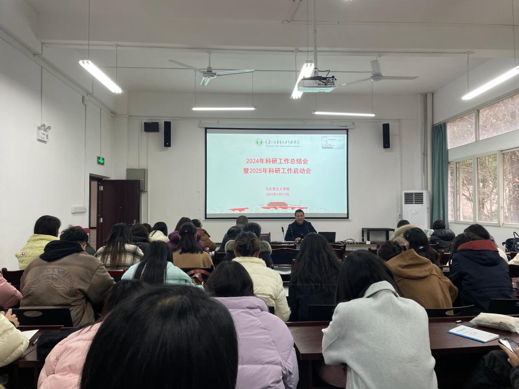 首先,陈爱文对2024年学院科研工作进行了全面总结。他指出在过去一年里,学院在课题申报、论文发表、平台建设等方面取得了一定的突破。在课题申报上,张锴、李冬菊分别获批重庆市社科规划博士项目和培育项目,实现学院立项的“零突破”,博士项目实现了学校的“零突破”。在论文发表上,刘达蔚、雷旭曦撰写的文章《推进大中小学思政课一体化建设,筑好时代新人精神根基》在《新华日报》刊登,实现了马院在省级日报发表理论文章的“零突破”。在平台建设上,心理健康教育发展中心成功入选“重庆市高校心理健康教育与咨询示范中心”,实现了市级科研平台建设的“零突破”。