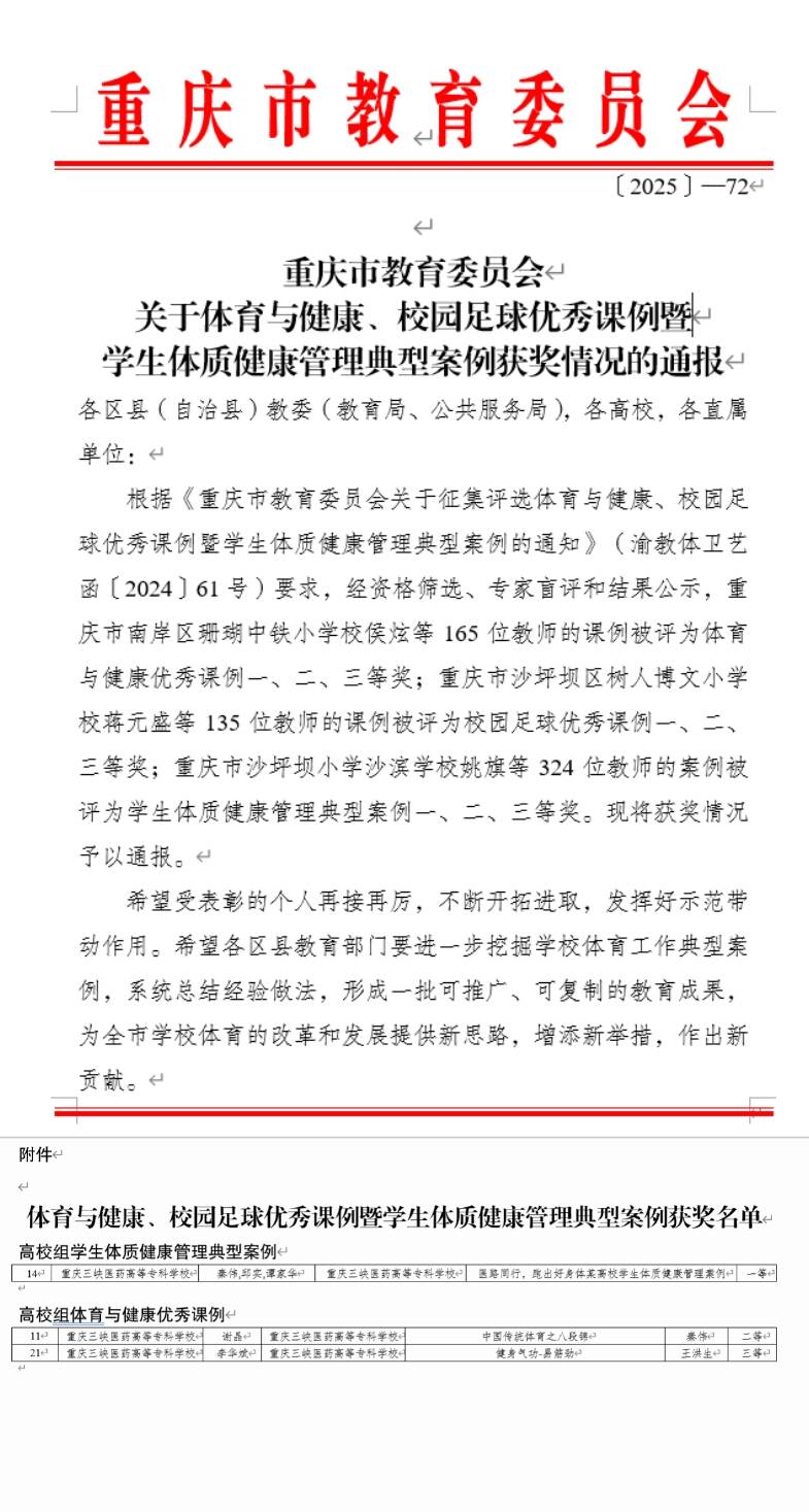 近日,重庆市教育委员会正式公布关于体育与健康、校园足球优秀课例暨学生体质健康管理典型案例获奖名单,我校公共基础部3个参赛作品全部获奖。其中,秦伟、邱实、谭家华作品荣获高校组学生体质健康管理典型案例一等奖,谢晶、李华斌作品分获高校组体育与健康优秀课例二等奖、三等奖。