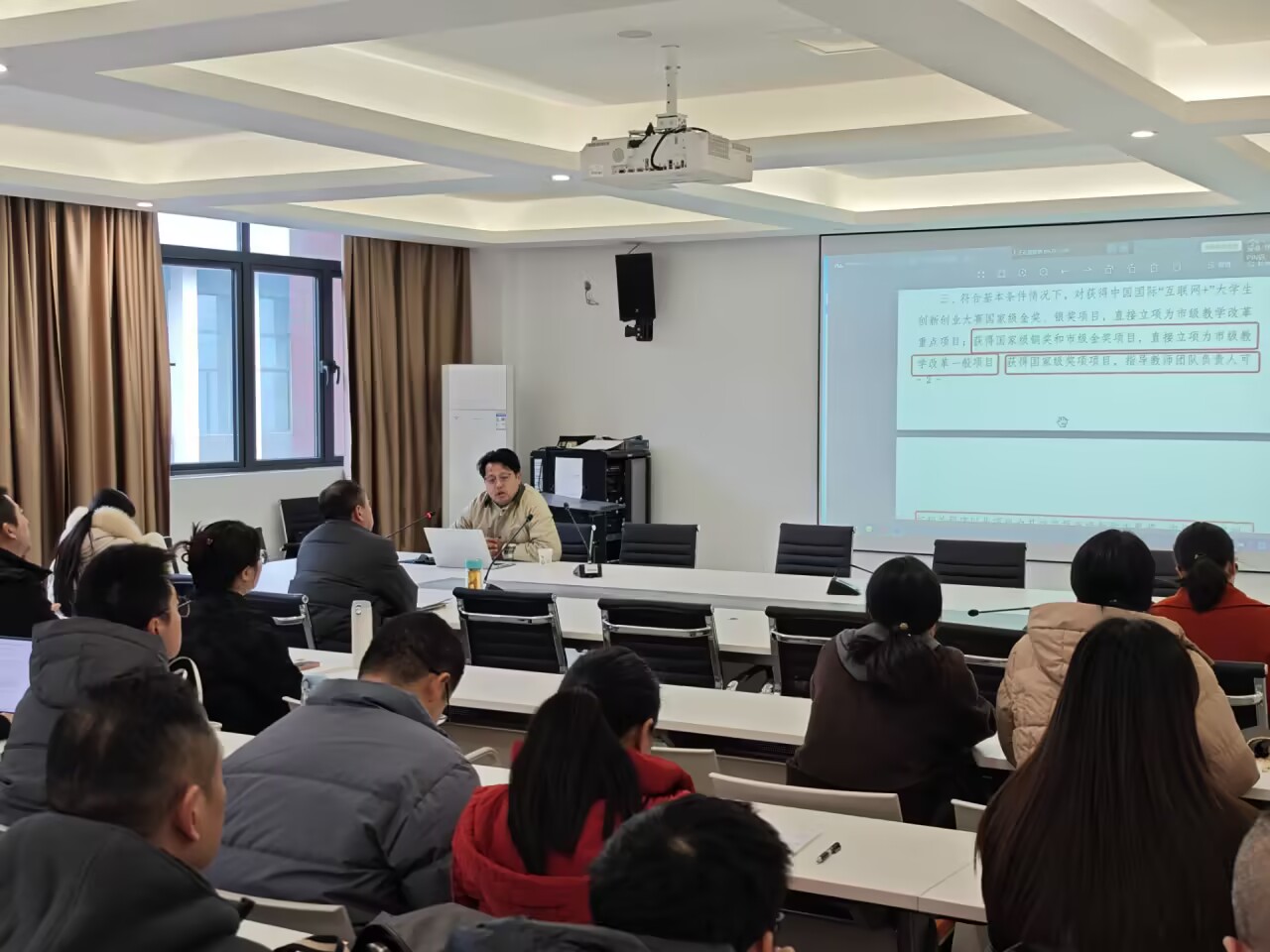 随后,易铭老师围绕“创新创业政策支持”“如何指导学生备战创新创业大赛”等关键问题进行了详细讲解。他结合已获奖案例,分享了项目选题、团队组建等方面的经验与技巧。易老师的讲座内容丰富、案例生动,既有理论高度,又有实践深度,为学院教师开展创新创业教育提供了新的思路和方法。