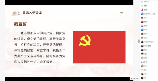 专题讲座后,全体毕业生党员通过线上平台,在“云端”庄严重温入党誓词。面对鲜红的党旗,铿锵的誓言再次强化了党员的身份认同与责任担当,激励大家在未来的工作生活中时刻以党员标准严格要求自己,发挥先锋模范作用。