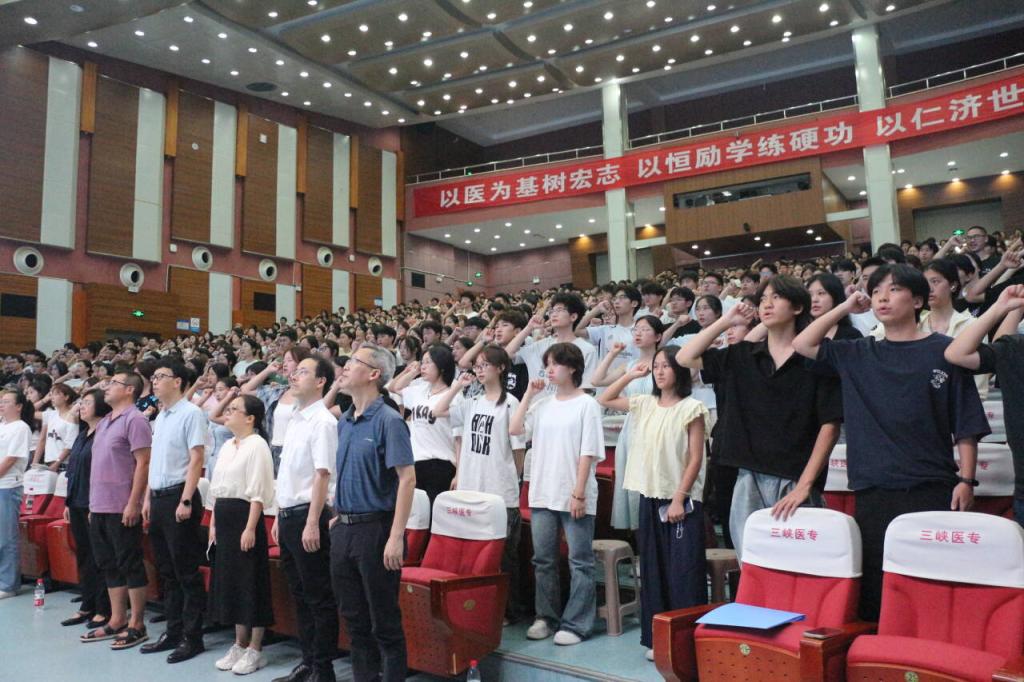 随后,典礼进入庄严的医学生宣誓环节,全体新生高举右拳,许下神圣而坚定的誓言,承诺恪守医德、尊师守纪、刻苦钻研,为祖国医药卫生事业与人类身心健康奋斗终生。