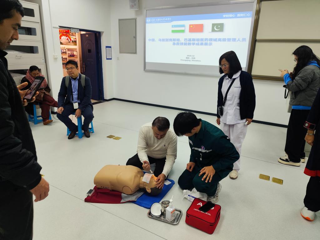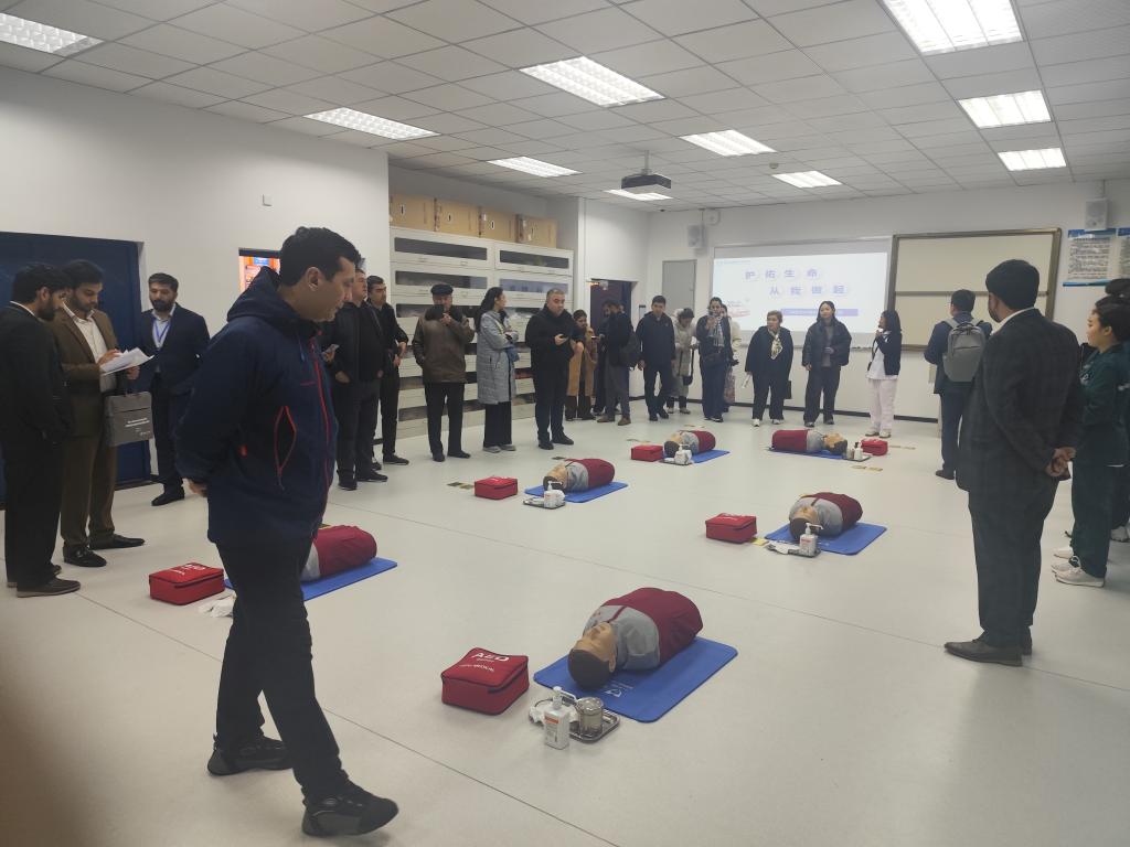 12月17日上午,在护理学院B5-109急救实训室,急救教研室主任邓辉为到访参与研修的27名外国来宾系统演示了心肺复苏(CPR)与自动体外除颤器(AED)的标准操作流程与技术要领。随后,乌兹别克斯坦两位院长及随行代表在邓辉和学校急救协会“急救先锋队”志愿者的指导下进行了实操体验,现场交流互动热烈。