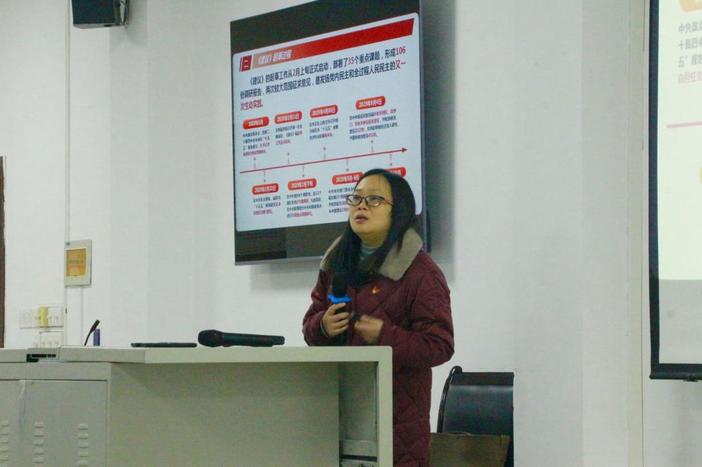 为深入学习宣传贯彻党的二十届四中全会精神,引导青年学子准确把握其核心要义与实践要求,12月17日,中医学院党总支副书记张宜蓓面向学院入党积极分子及其他学生代表共100余人,开展了专题宣讲。