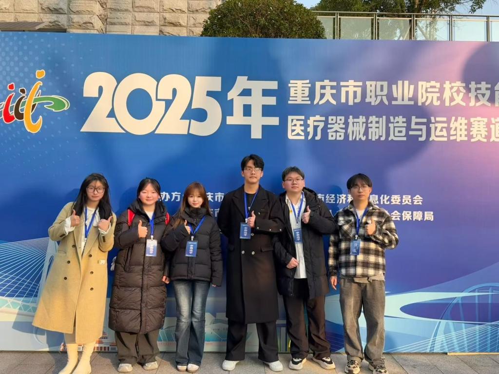 近日,由重庆市教育委员会、重庆市经济和信息化委员会、重庆市财政局、重庆市人力资源和社会保障局联合主办,重庆医药高等专科学校承办的2025年重庆市职业院校技能大赛医疗器械制造与运维赛道(高职组)赛事顺利举行,来自全市多所高职院校的参赛队伍齐聚一堂。我校医学技术学院院长郝坡带队指导教师、参赛学生参赛,经激烈角逐,喜获三等奖。