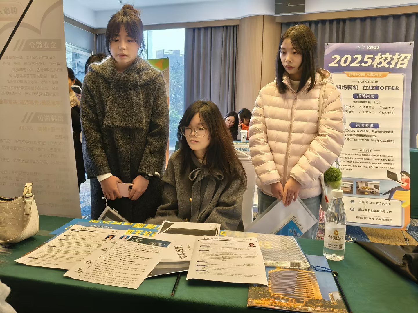 北京浩丽君医疗器械发展有限公司、重庆月月安健康管理有限公司与重庆忆享科技有限公司等八家企事业单位参与招聘,合计提供近200个就业岗位,吸引了预防医学、食品营养与健康等专业学生前来参会。对未能到达现场的同学,辅导员帮助学生打印投递简历,协助向用人单位推荐优秀学生。同学们手持精心准备的简历穿梭在各个用人单位之间,积极与用人单位交流互动,了解工作内容、薪资待遇、发展空间等问题。据悉,双选会现场有3名学生已初步与用人单位达成签约意向,2名同学进入下一阶段面试环节。公卫学院专职副书记李生、辅导员田锐、陈倩还对现场企业进行了访企拓岗,并进行深入交流,拓展实习就业岗位,加强院企联系与合作,进一步推动学院实习就业工作。